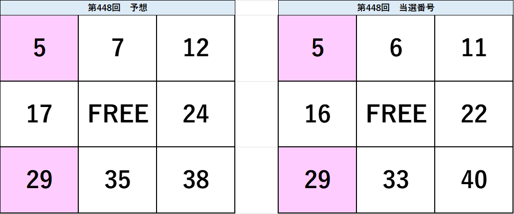 ▼ビンゴ5 第448回 予想と当選番号(タップで拡大できます)