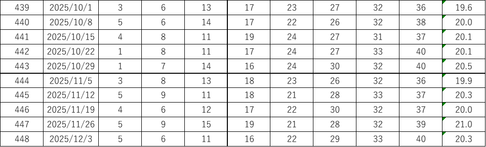 今回の第449回(2025年12月10日抽せん)に向けて、過去データをもとにした考察とあわせて、よく出る数字や出現回数、平均値、連続回数、スキップ回数などをピックアップしています。