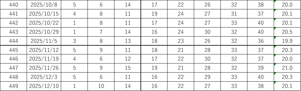 今回の第450回(2025年12月17日抽せん)に向けて、過去データをもとにした考察とあわせて、よく出る数字や出現回数、平均値、連続回数、スキップ回数などをピックアップしています。