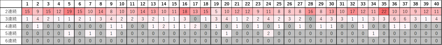 一方で、3連続以上はかなり少なく、4連続はごく一部、5連続はさらに稀で、6連続は449回の中で一度もありません。
