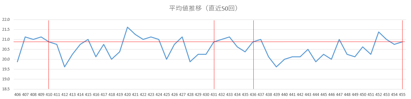 一方で、過去455回の中で最も低かった平均値は18.8、最も高かった平均値は21.8となっており、振れ幅はあるものの、全体としては「19〜21」台に集まる傾向が見られます。
