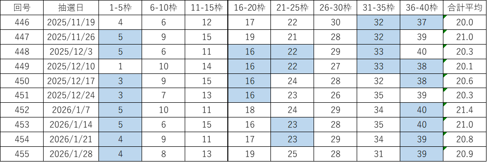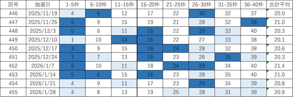 今回の第456回(2026年02月04日抽せん)に向けて、過去データをもとにした考察とあわせて、よく出る数字や出現回数、平均値、連続回数、スキップ回数などをピックアップしています。