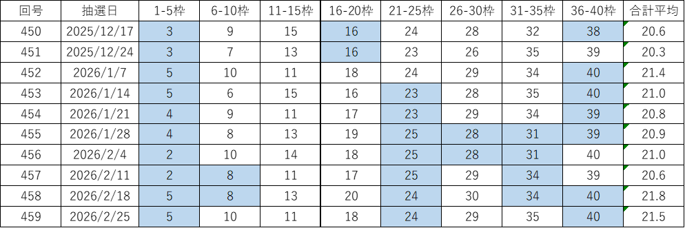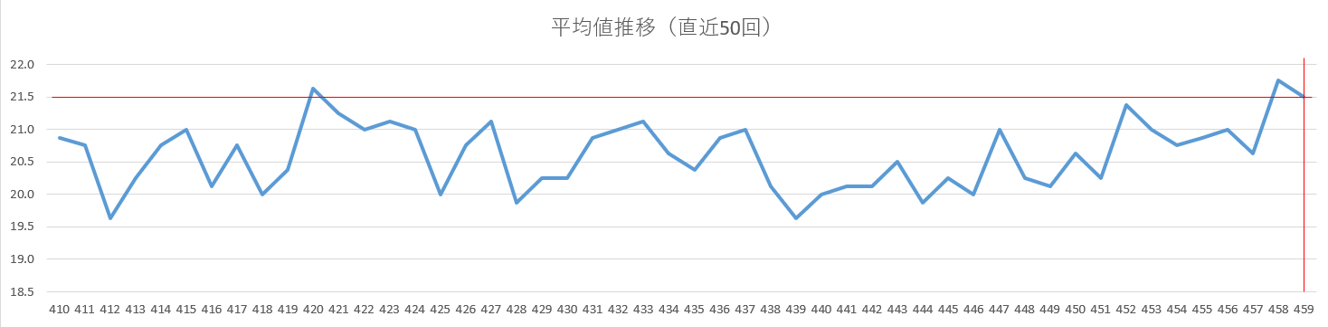 一方で、過去459回の中で最も低かった平均値は18.8、最も高かった平均値は21.8となっており、振れ幅はあるものの、全体としては「19〜21」台に集まる傾向が見られます。