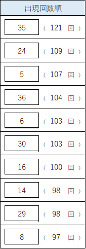 最も出現している数字は 【35】(121回) で、ダントツの1位。