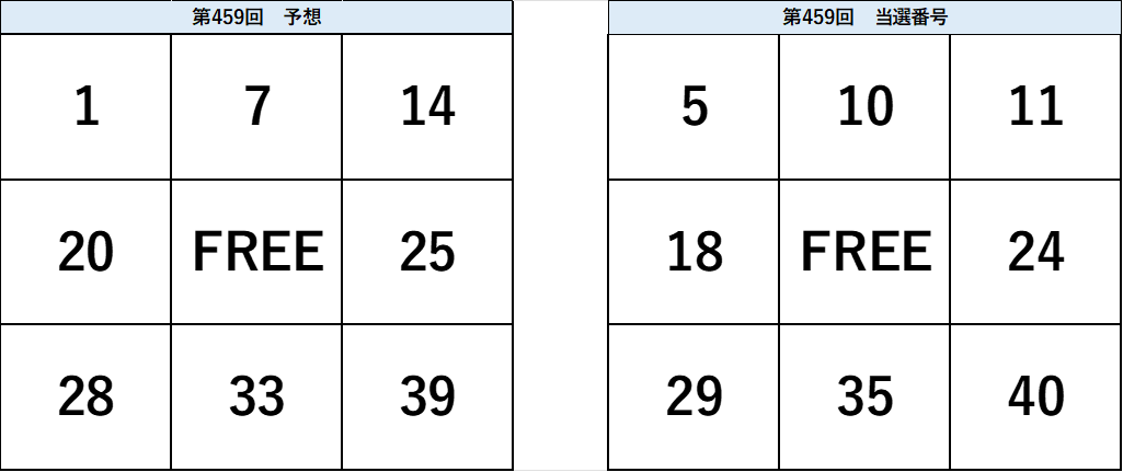 ビンゴ5第459回の予想数字と当選番号の比較表。予想と結果の一致部分が視覚的に確認できる図。