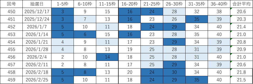 今回の第460回(2026年03月04日抽せん)に向けて、過去データをもとにした考察とあわせて、よく出る数字や出現回数、平均値、連続回数、スキップ回数などをピックアップしています。