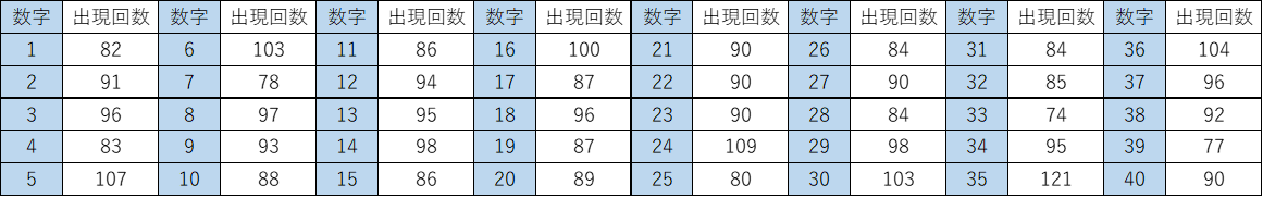 出現回数順の画像の下に 全40数字の出現回数一覧表出現回数を視覚化した棒グラフ を掲載しています。