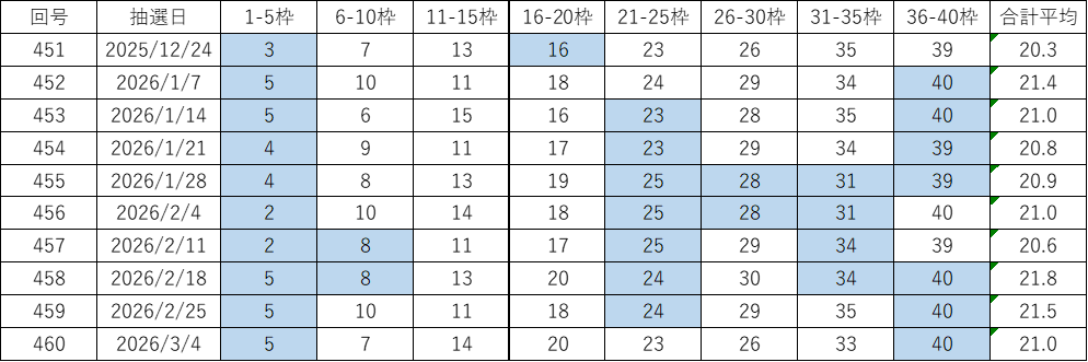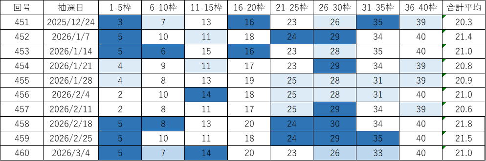 今回の第461回(2026年03月11日抽せん)に向けて、過去データをもとにした考察とあわせて、よく出る数字や出現回数、平均値、連続回数、スキップ回数などをピックアップしています。