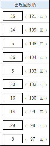 最も出現している数字は 【35】(121回) で、ダントツの1位。