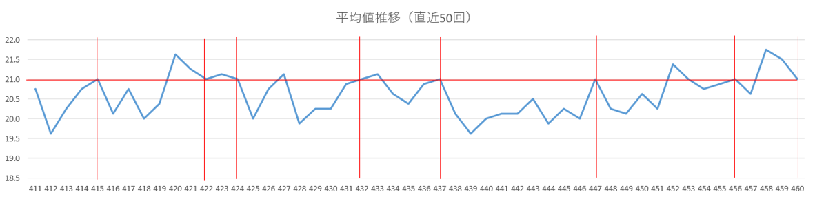 一方で、過去460回の中で最も低かった平均値は18.8、最も高かった平均値は21.8となっており、振れ幅はあるものの、全体としては「19〜21」台に集まる傾向が見られます。