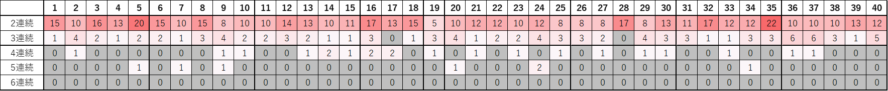 一方で、3連続以上はかなり少なく、4連続はごく一部、5連続はさらに稀で、6連続は460回の中で一度もありません。